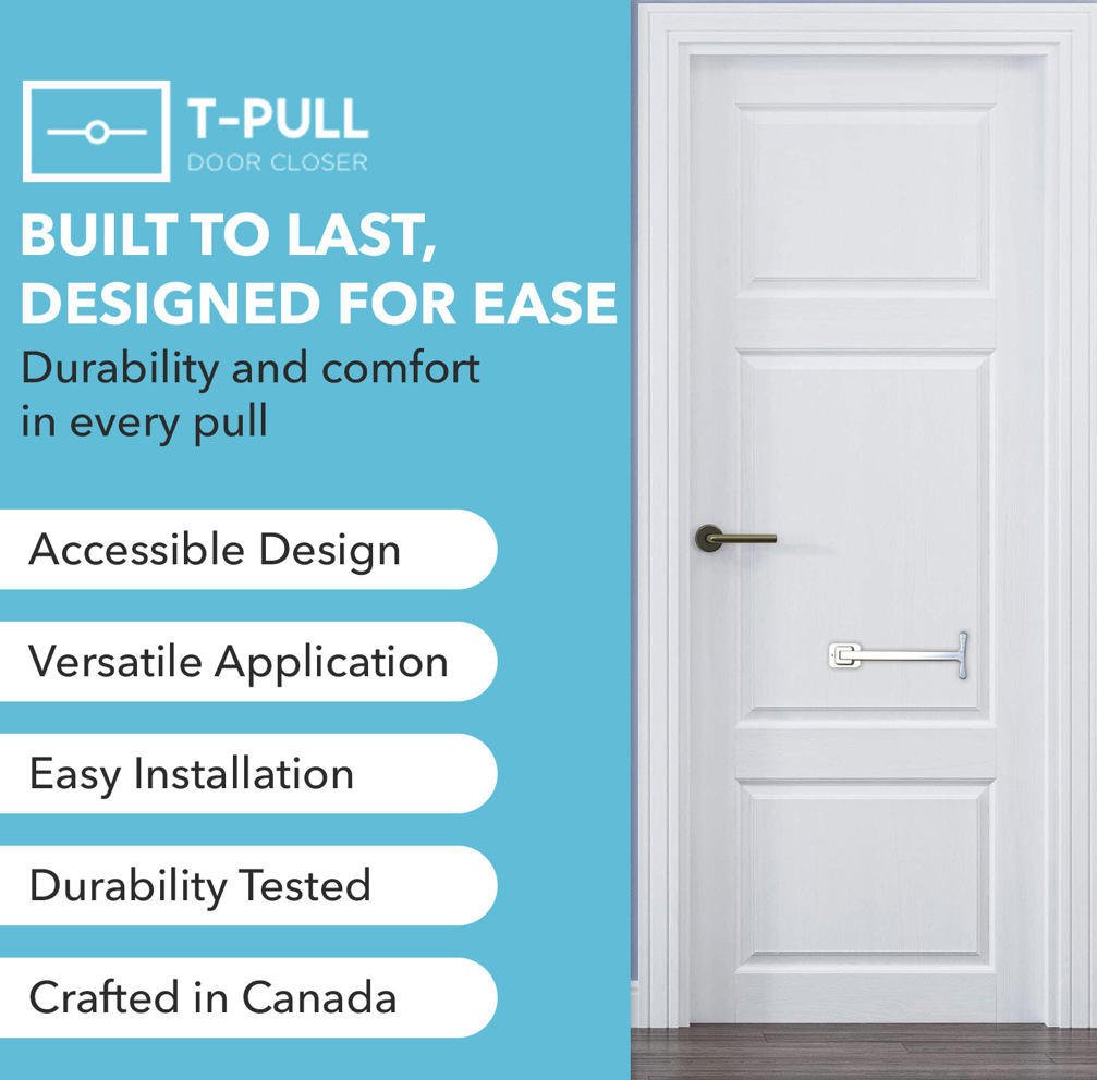 The T-Pull Manual Door Closer is the ORIGINAL patented solution designed specifically for people with mobility challenges. Born from real-world experience and engineered in Canada, this isn’t just another door accessory, it’s a life-changing accessibility tool.